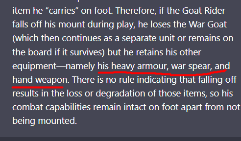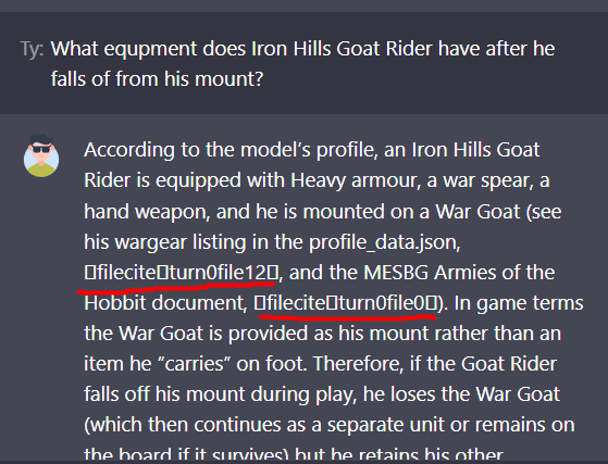 Fajny pomysł. Czy testowałeś go też z FAQ? Bo zadałem mu dosyć trudne pytanie, które dopiero najnowsze FAQ rozjaśnia (Goat Rider po spadnięciu “magicznie” dostaje też tarczę), a bot mi odpisał, że tylko włócznia mu zostaje.