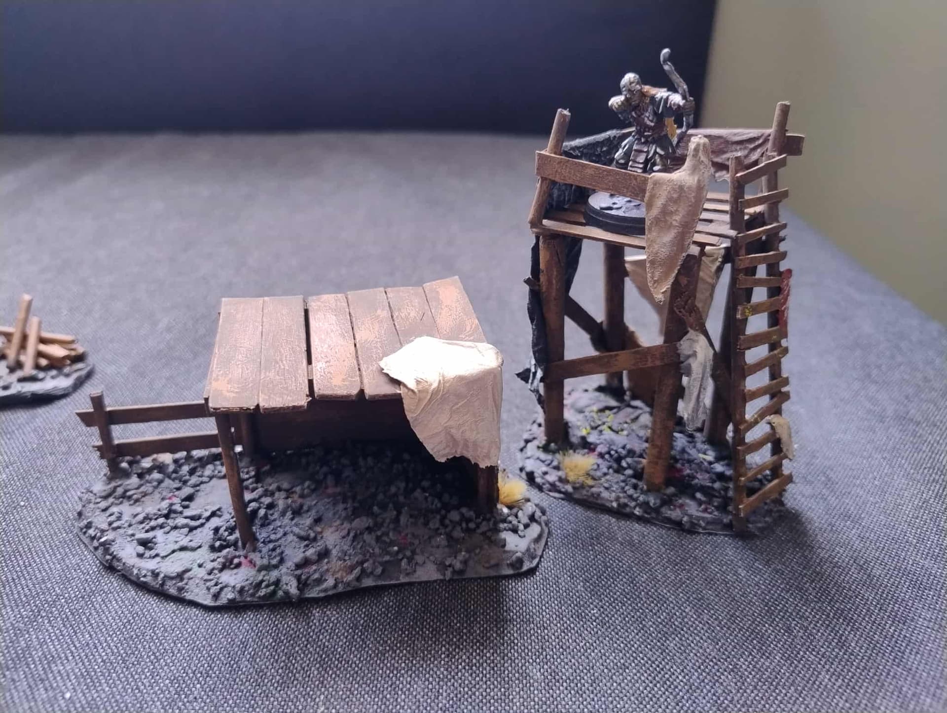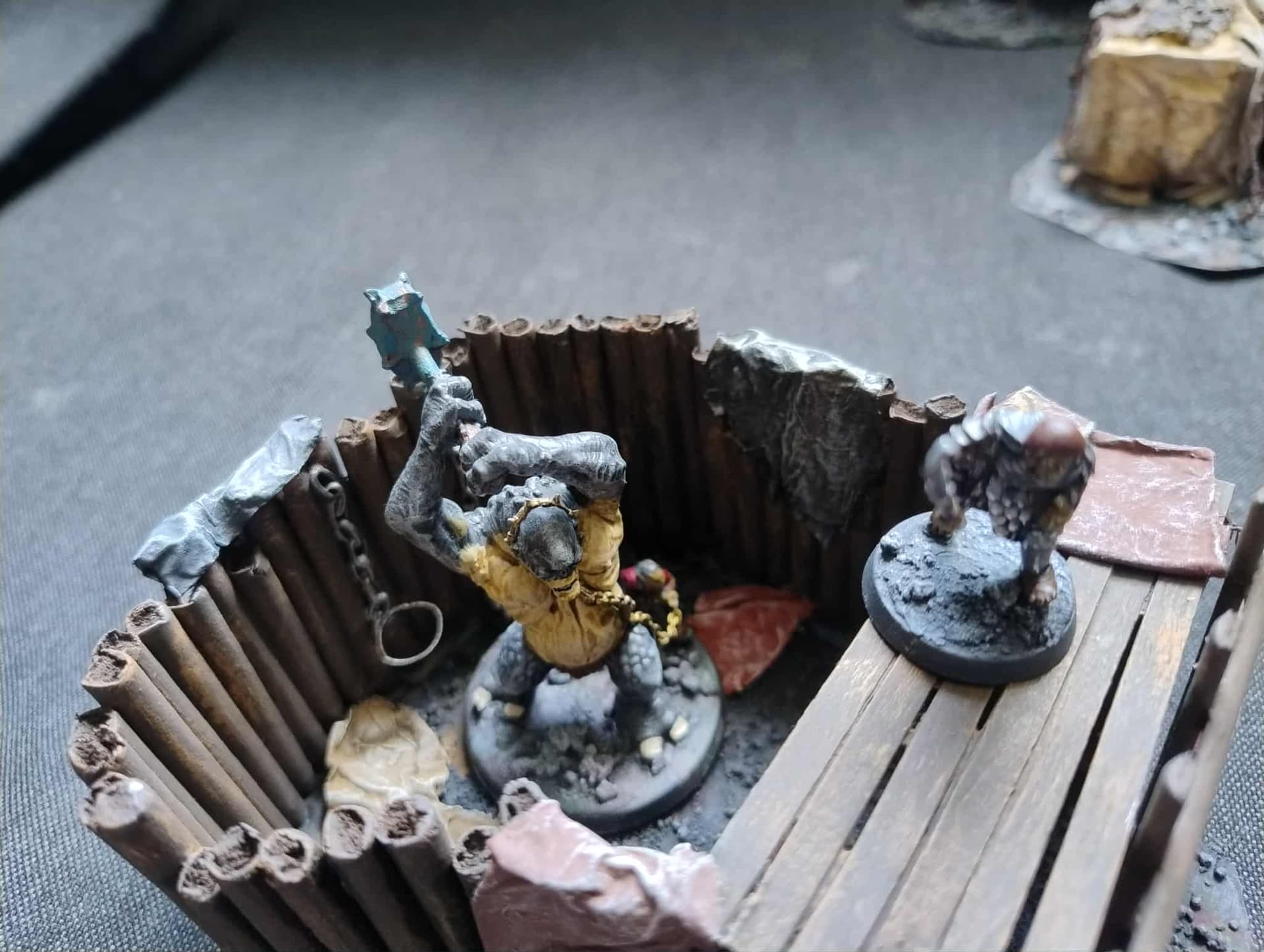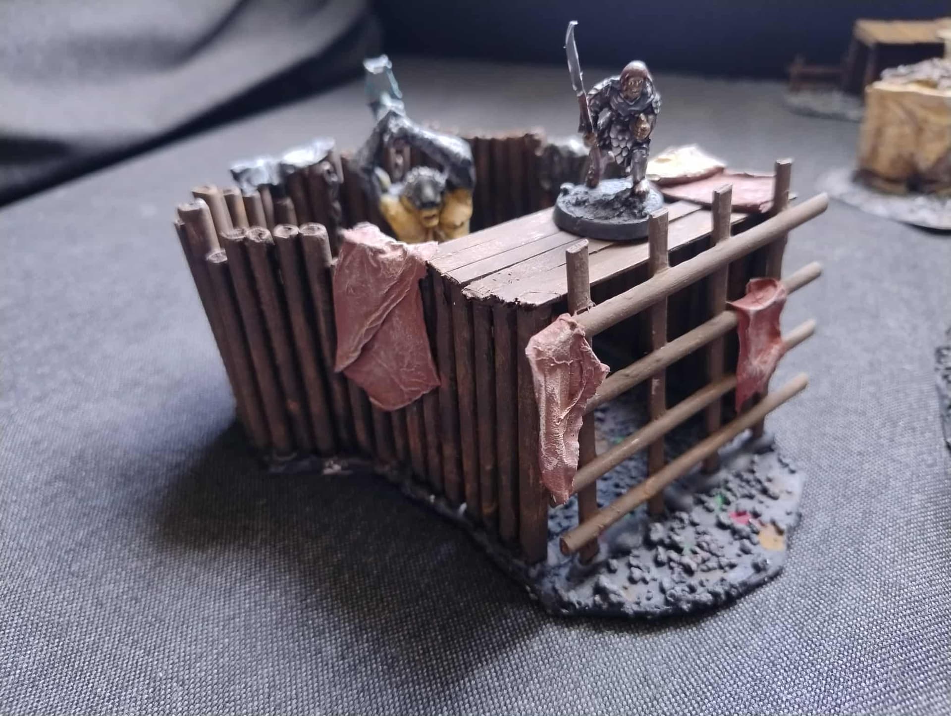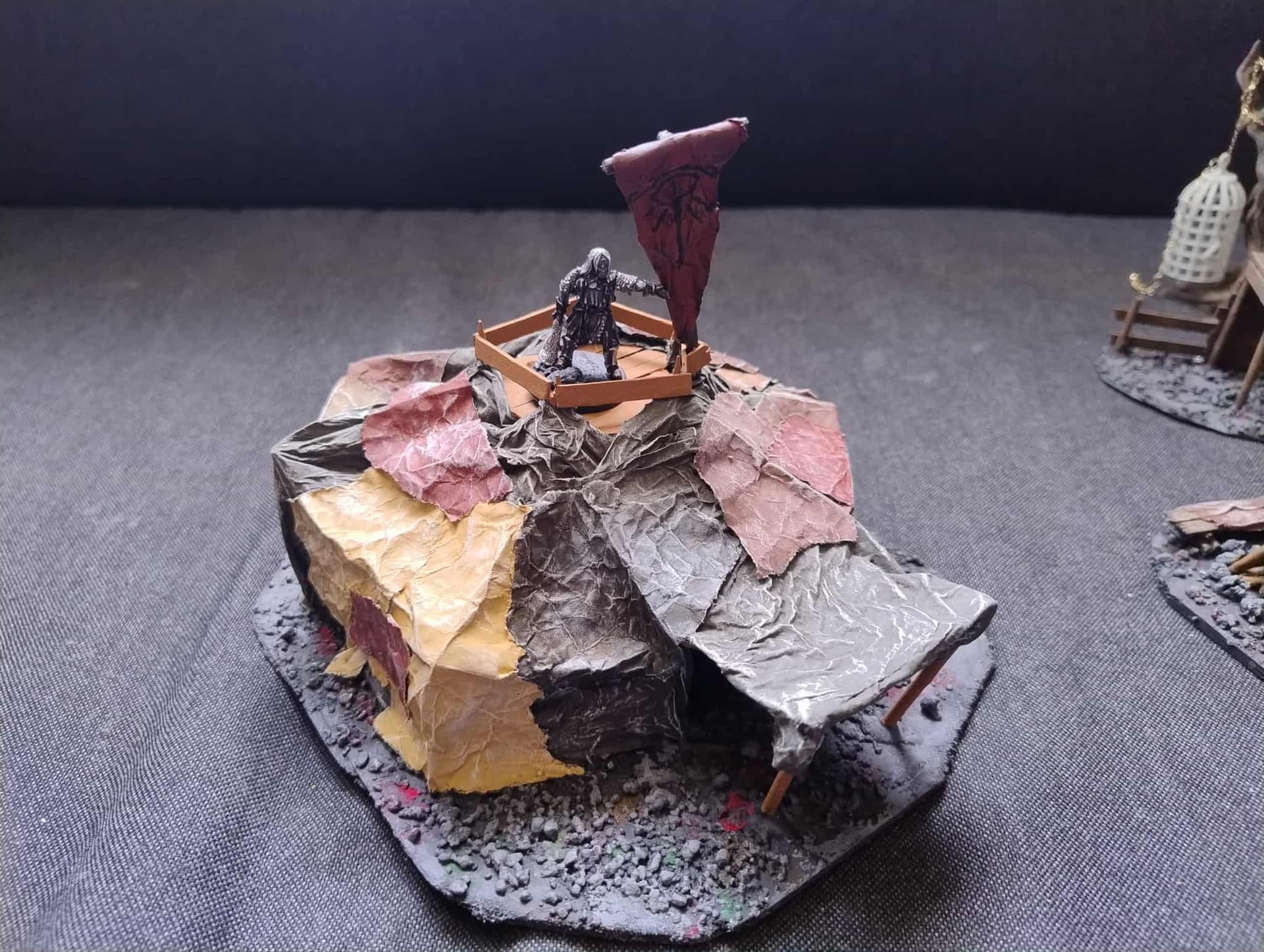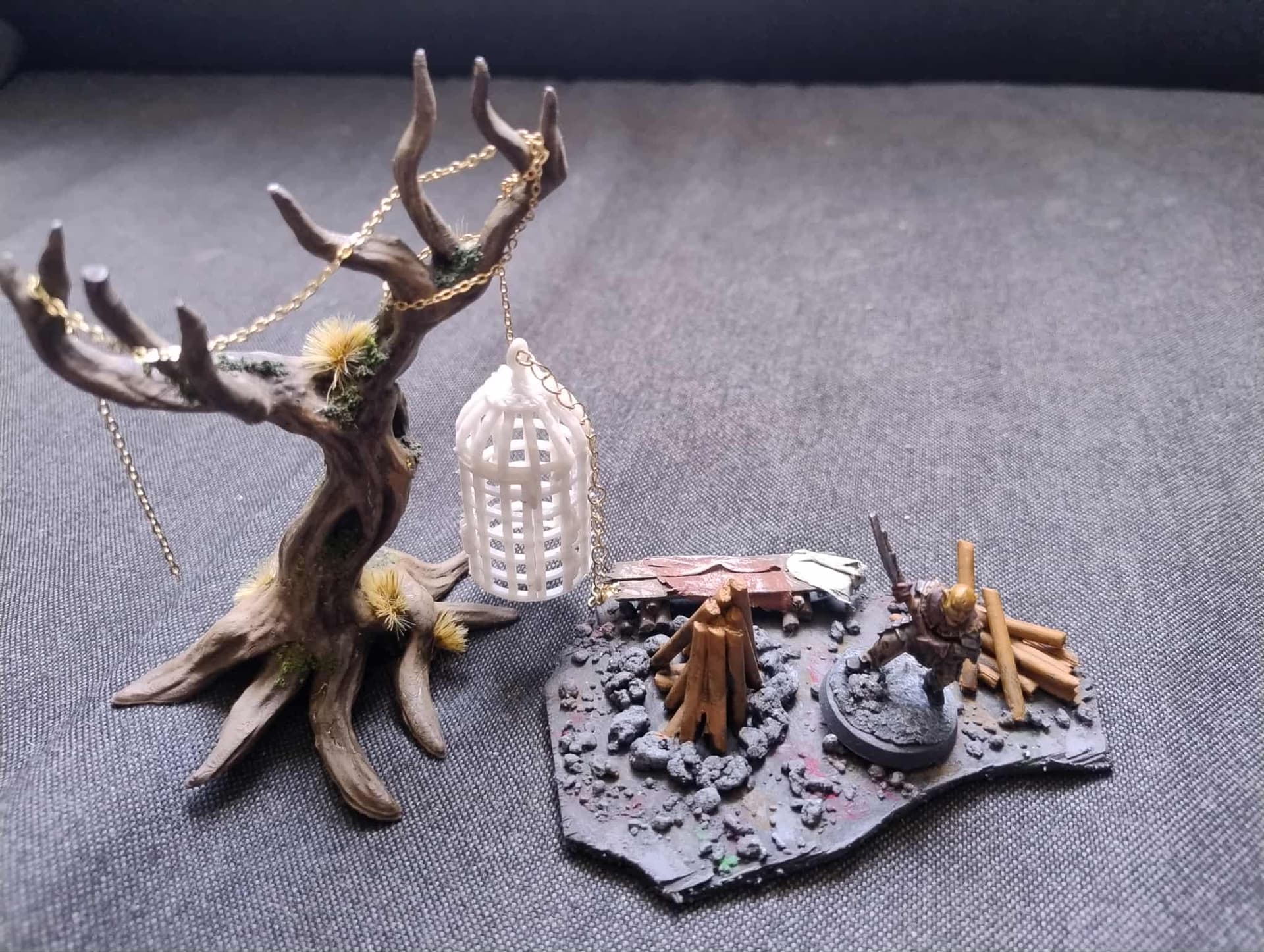 Ognisko i drzewko z klatką. Drzewo i klatka to druk 3d, jak widac musze jeszcze pomalowac klatke i dokleic do drzewa lancuch, + musze kogos dac do klatki (mam jednego Minasa chętnego :p)